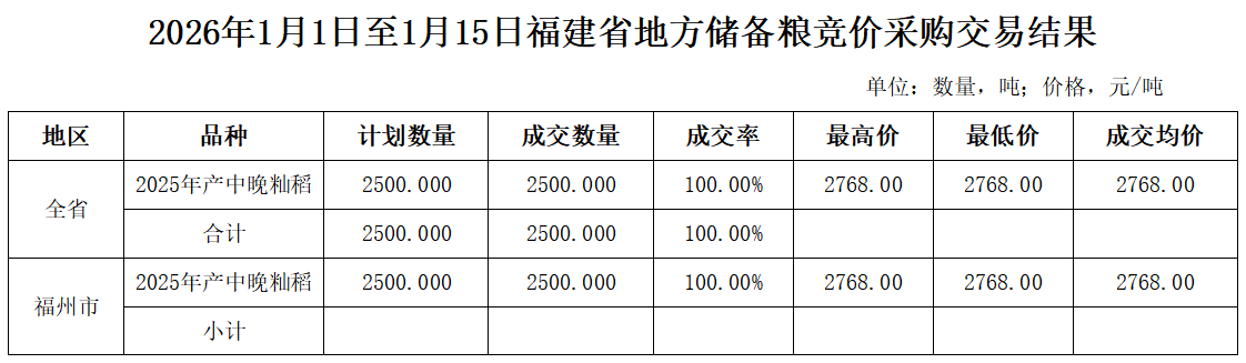 - 2026年1月1日至1月15日福建省地方储备粮竞价采购交易结果 2026-01-16