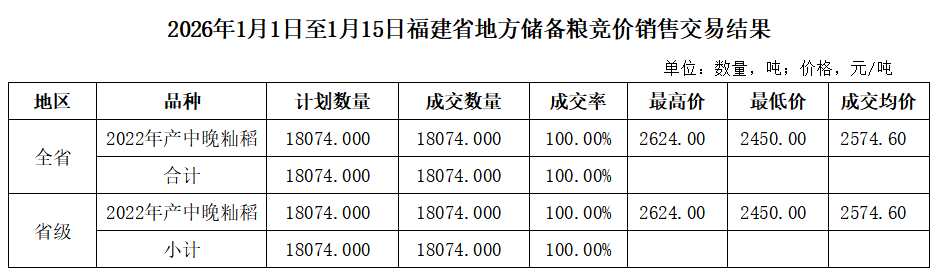- 2026年1月1日至1月15日福建省地方储备粮竞价销售交易结果 2026-01-16