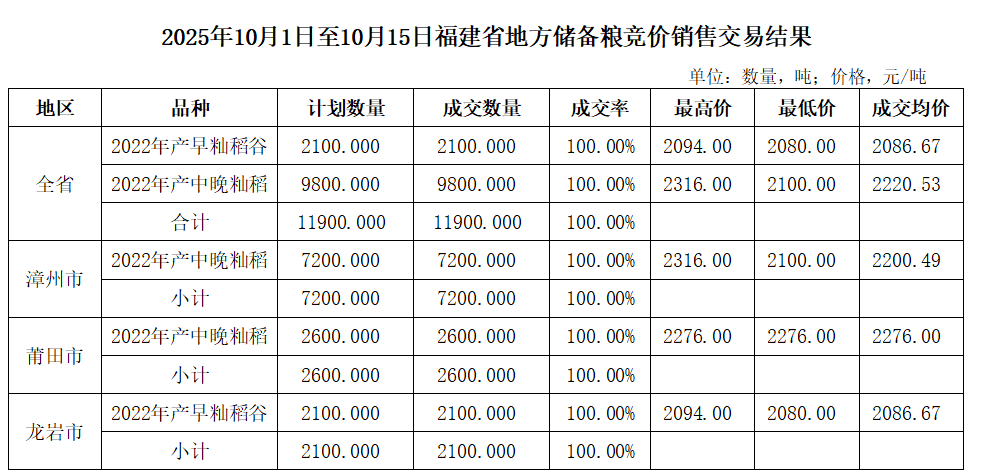 - 2025年10月1日至10月15日福建省地方储备粮竞价销售交易结果 10-17